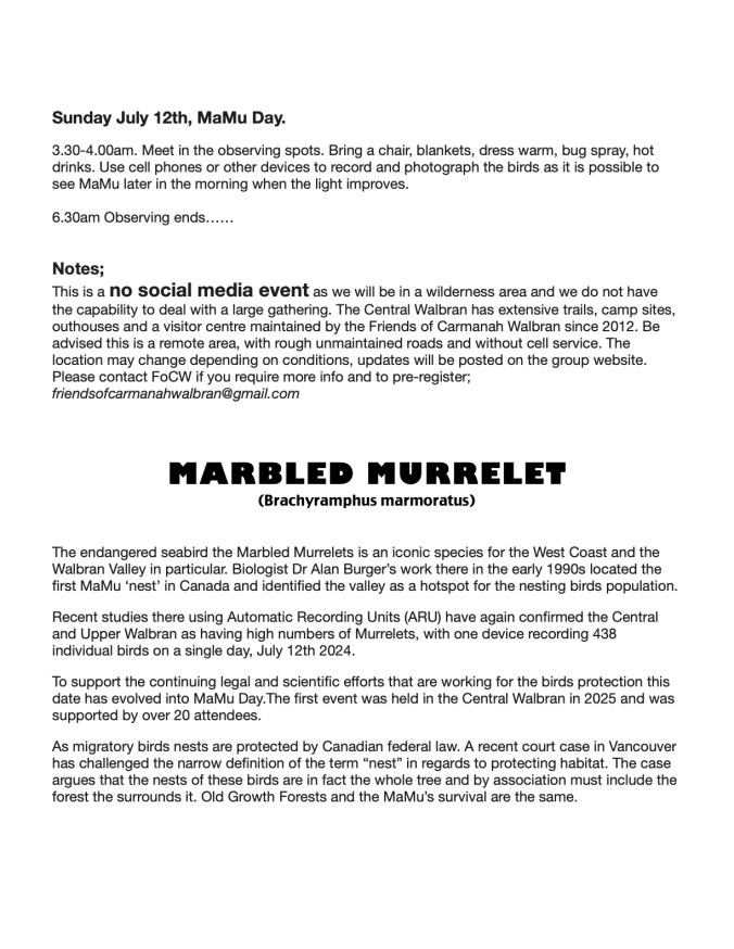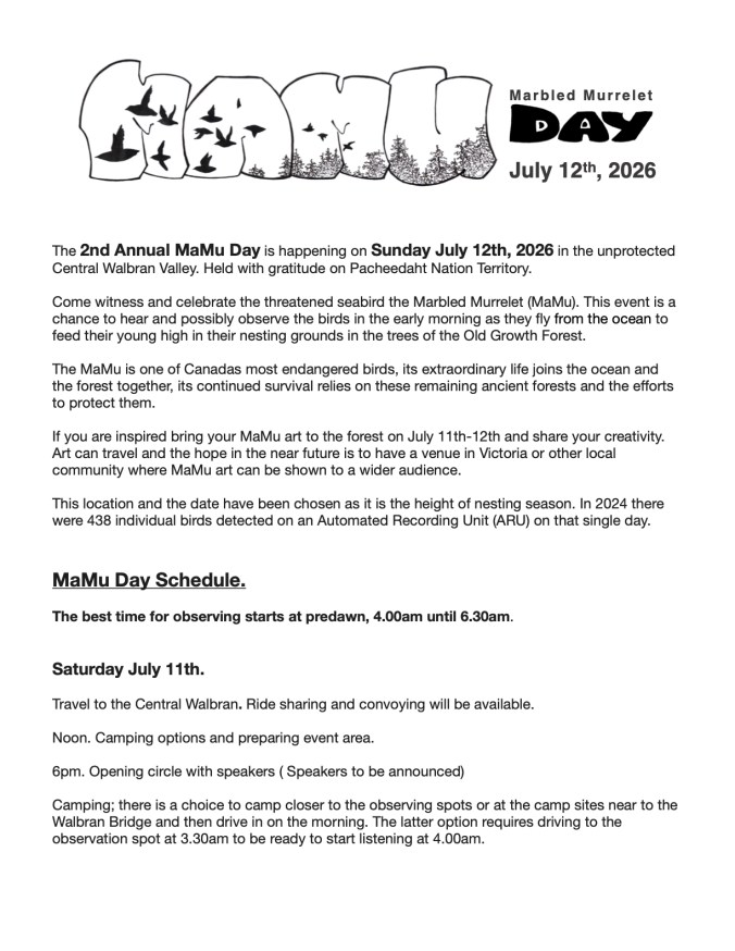 The Marbled Murrelet is becoming an ever more endangered bird and this event was organized in the hopes of raising awareness of its plight and to create connections and community to work for its protection.