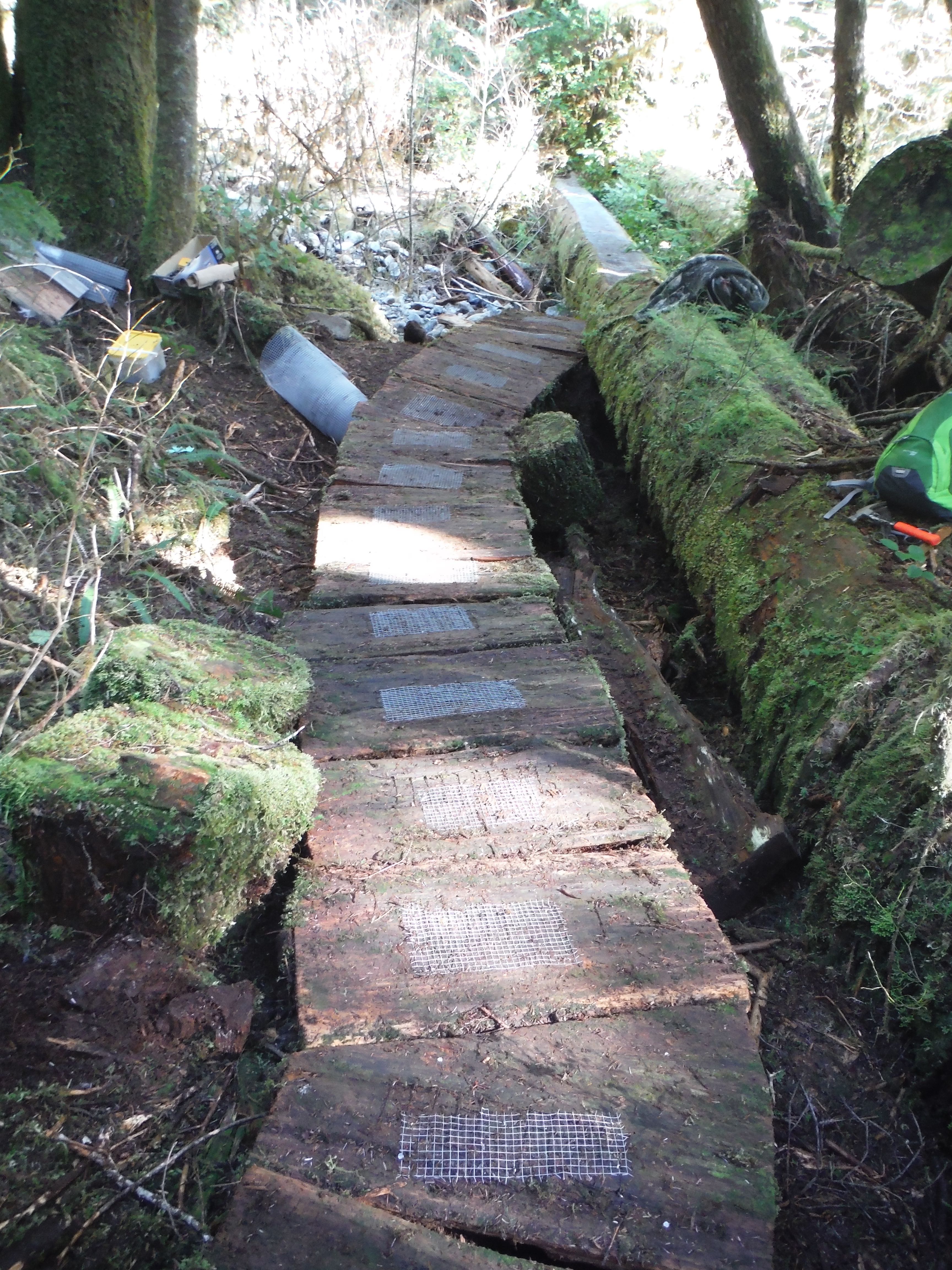 Trail Clearing: Trail clearing has happened from time to time since the trail was built, which is the only thing that has stopped the trail from being swallowed up by the forest. That being said, a huge amount of time was spent cutting back salal from the trail and exposing the ground. Trail clearing is an ongoing project that will never be completed so long as the forest keeps growing, but we made good progress in this area.
