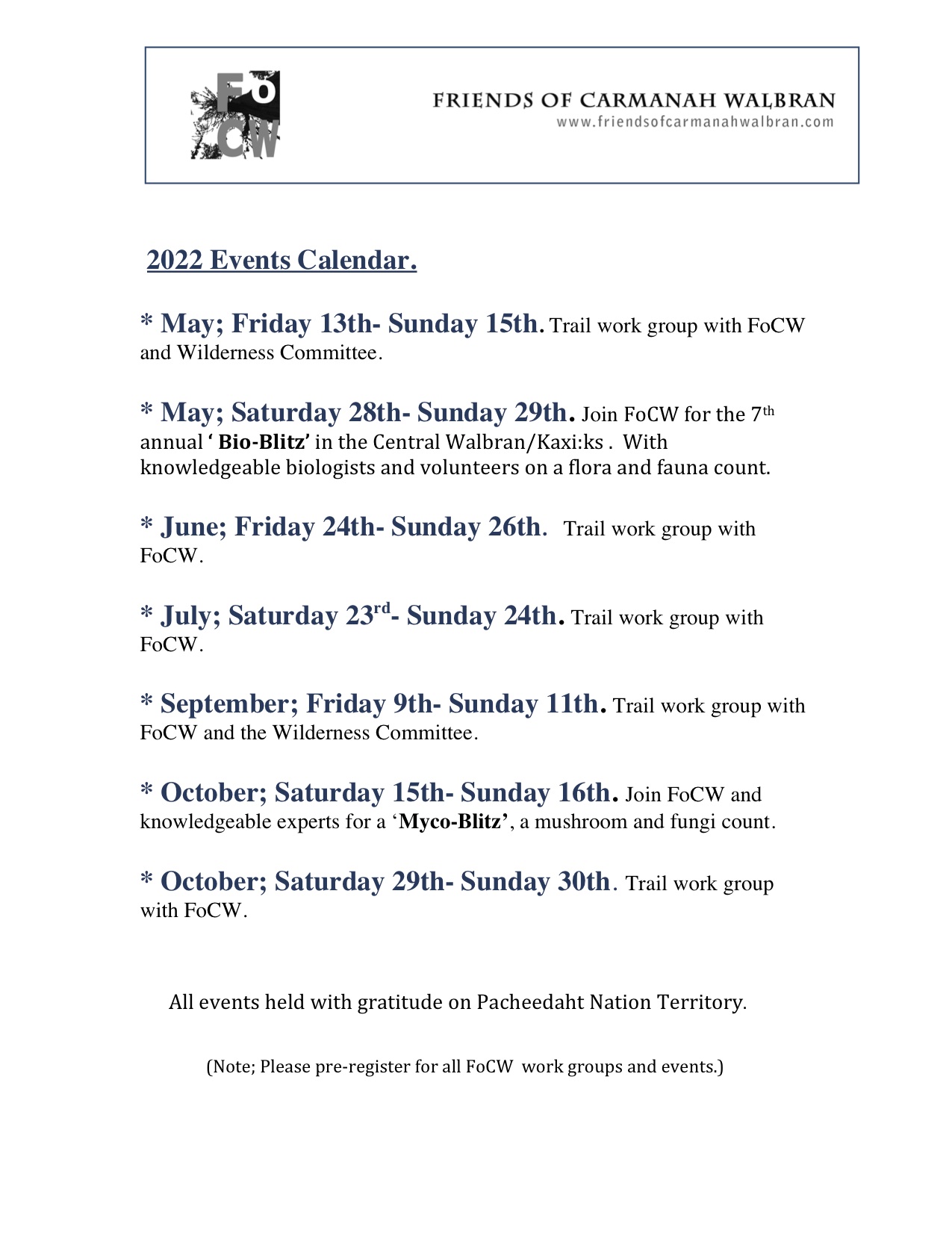 2022 Calendar March 24, 2022May 20, 2022 / Friends of Carmanah Walbran FoCWs new calendar for 2022, if you wish to attend please contact us to register. Share this: Click to share on X (Opens in new window) X Click to share on Facebook (Opens in new window) Facebook Like Loading... Related