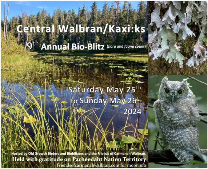 For this years Bio-blitz the Friends have teamed up with Dr Royann Petrell and the Old Growth Birders and Bio-blitzers. This year we will be surveying in a different location, within a ‘cloud forest and lichen rich area towards Sad Lk in the unprotected undeferred Central Walbran. This event is held with gratitude on the traditional territory of the Pacheedaht Nation.