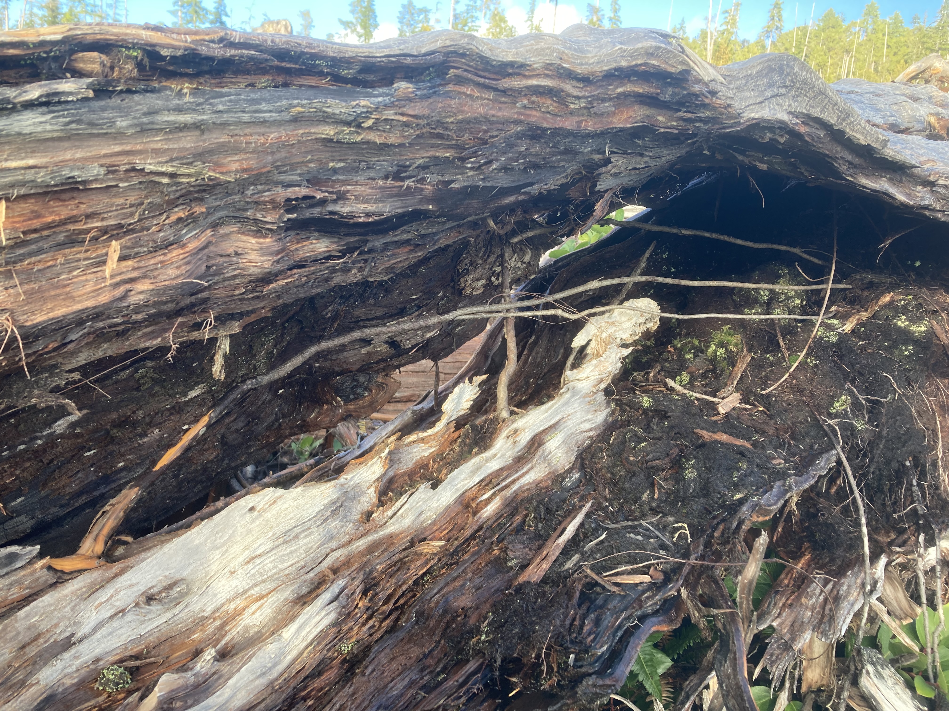 Internal roots seen growing in hollow truck of fallen yew in clearcut.