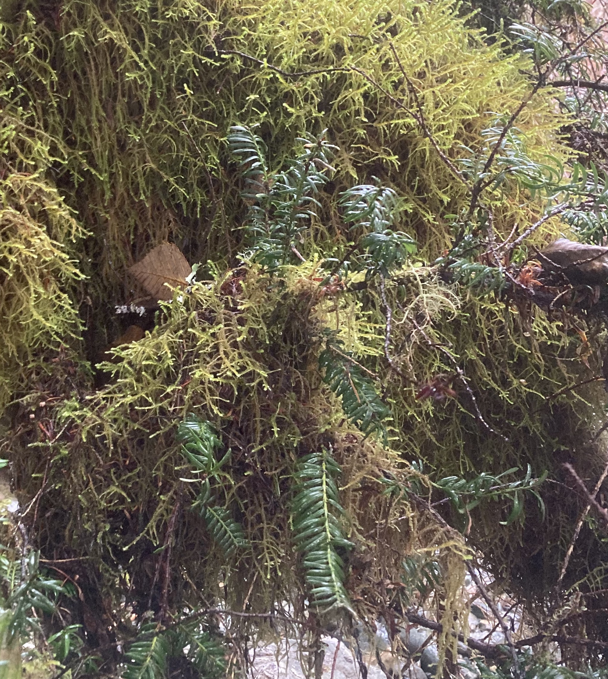 Pacific Yew branches almost completely covered in mosses, (Douglas Neckera; Neckera douglasii and Cat-Tail Moss; Isothecium myosiroides)